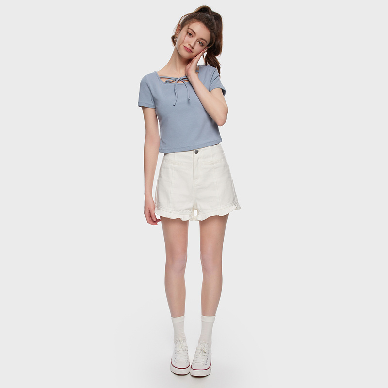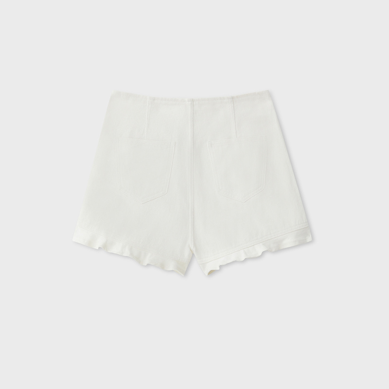 "Showing your charming side with these denim shorts. Detailed with ruffle hem for a subtle girly touch.