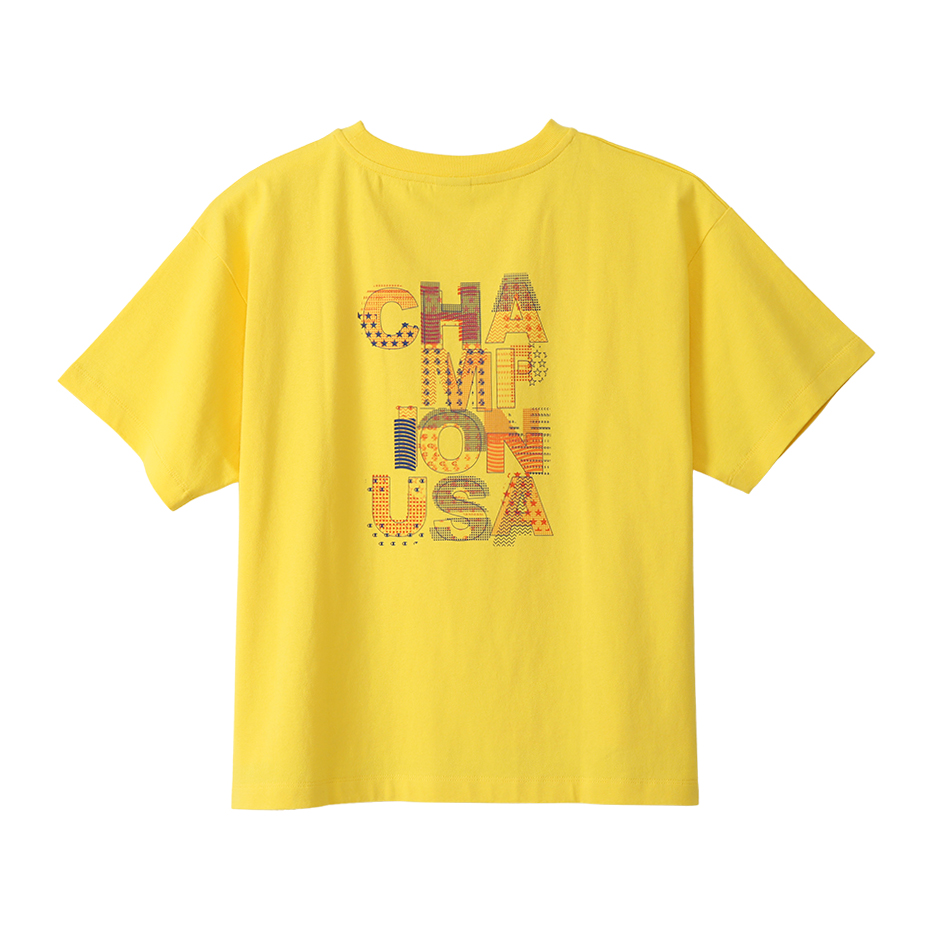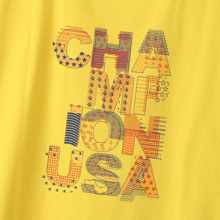 A dry and comfortable short-sleeved T-shirt made from 100% sustainable American cotton "Cotton USA" produced with consideration for the environment. Loose fit with plenty of room in the width of the body and shoulders. It has a unique design with different hem lengths before and after the side slits. The large “CHAMPION” graphic on the back is made up of small figures such as stars and polka dots, and is printed in three different colors for each body color with highly pigmented ink. Due to the product washing process, it has a familiar texture from the beginning of wearing and is difficult to shrink after washing.