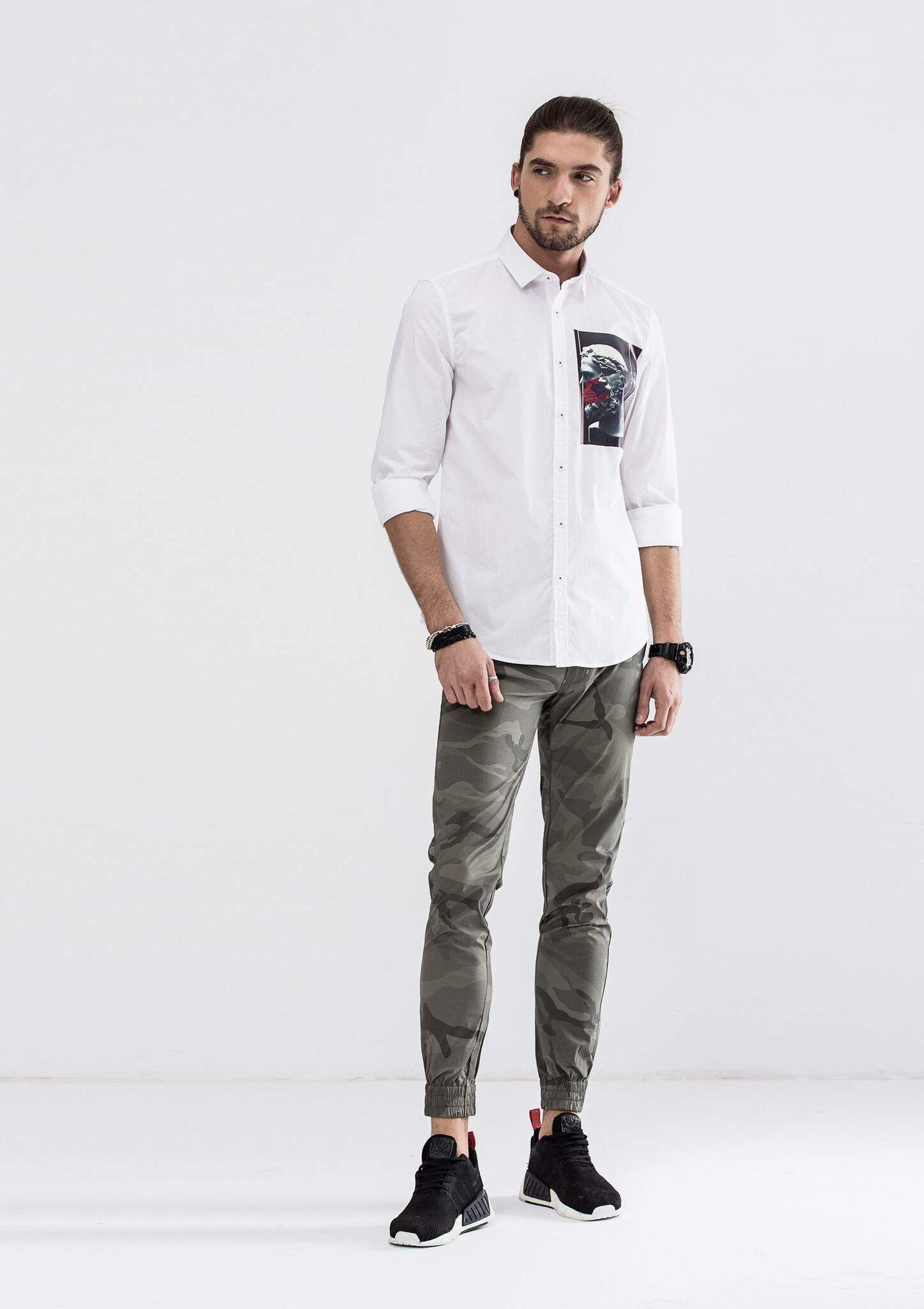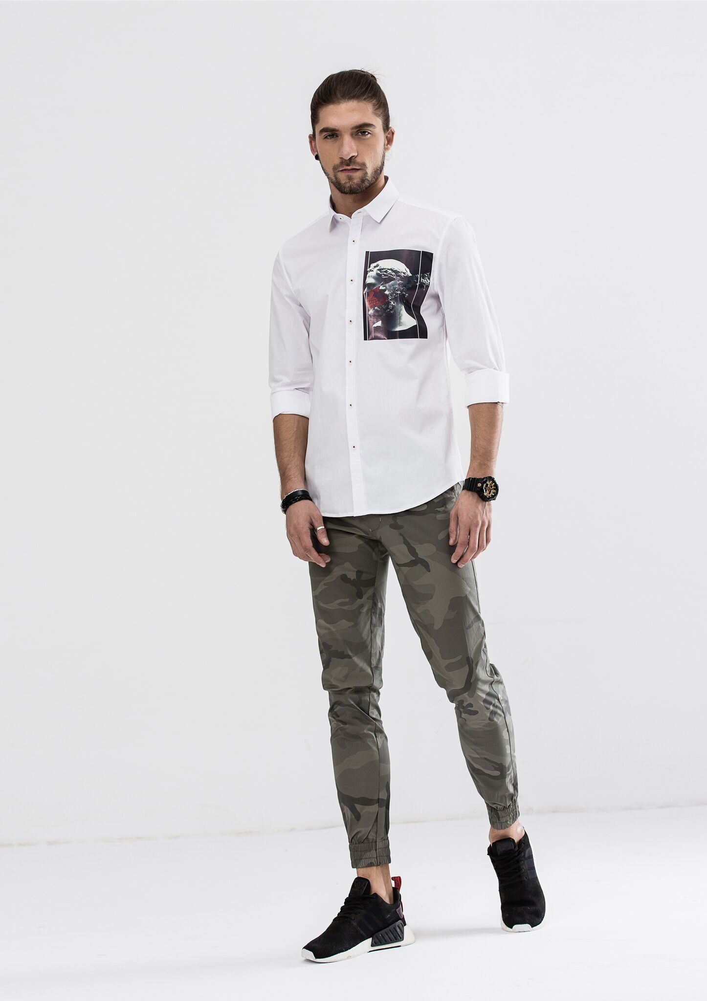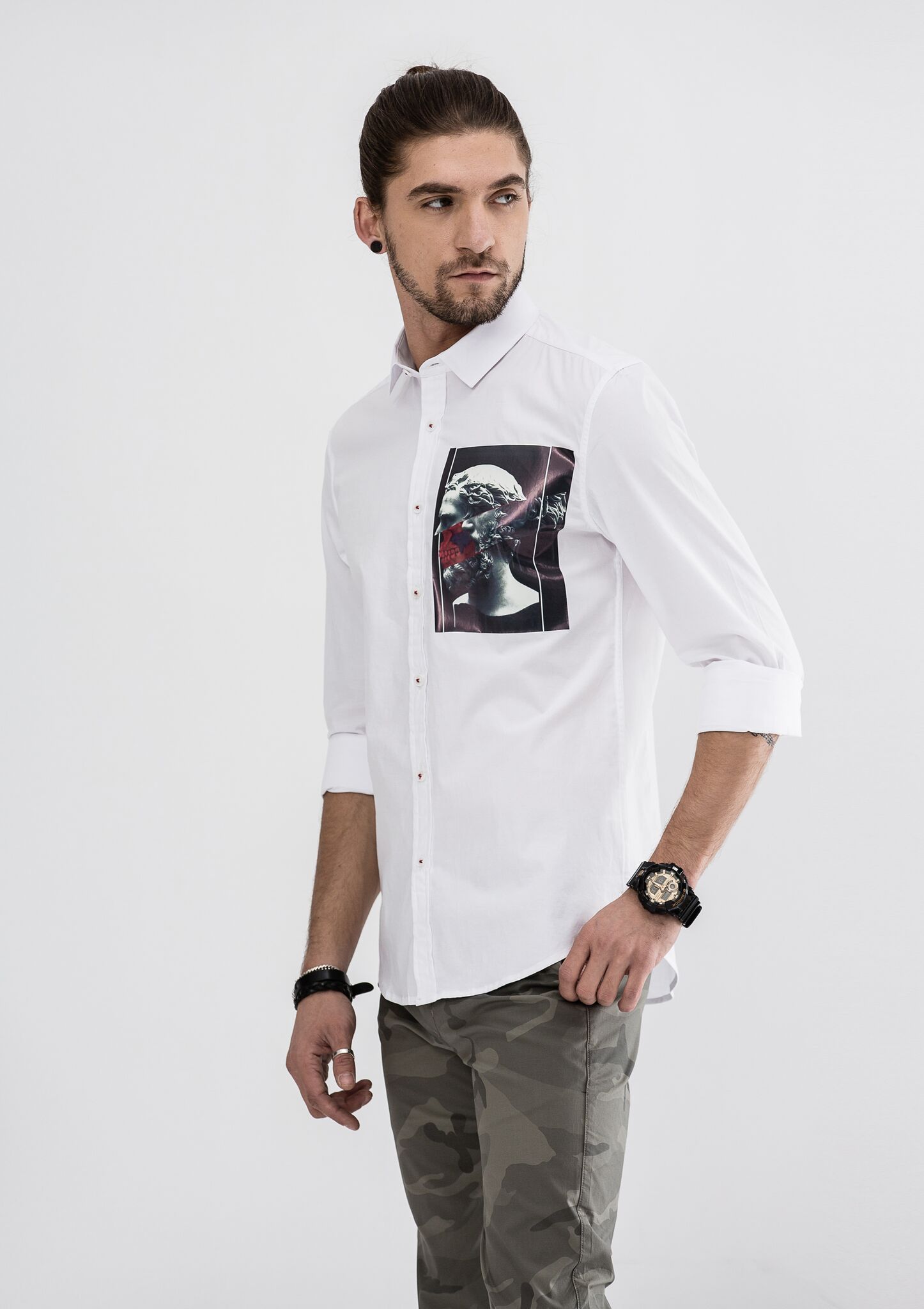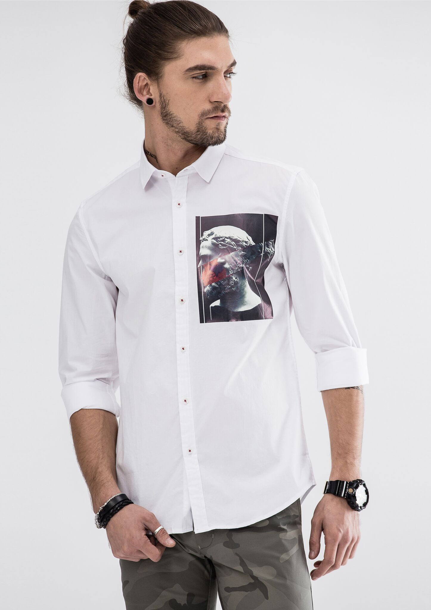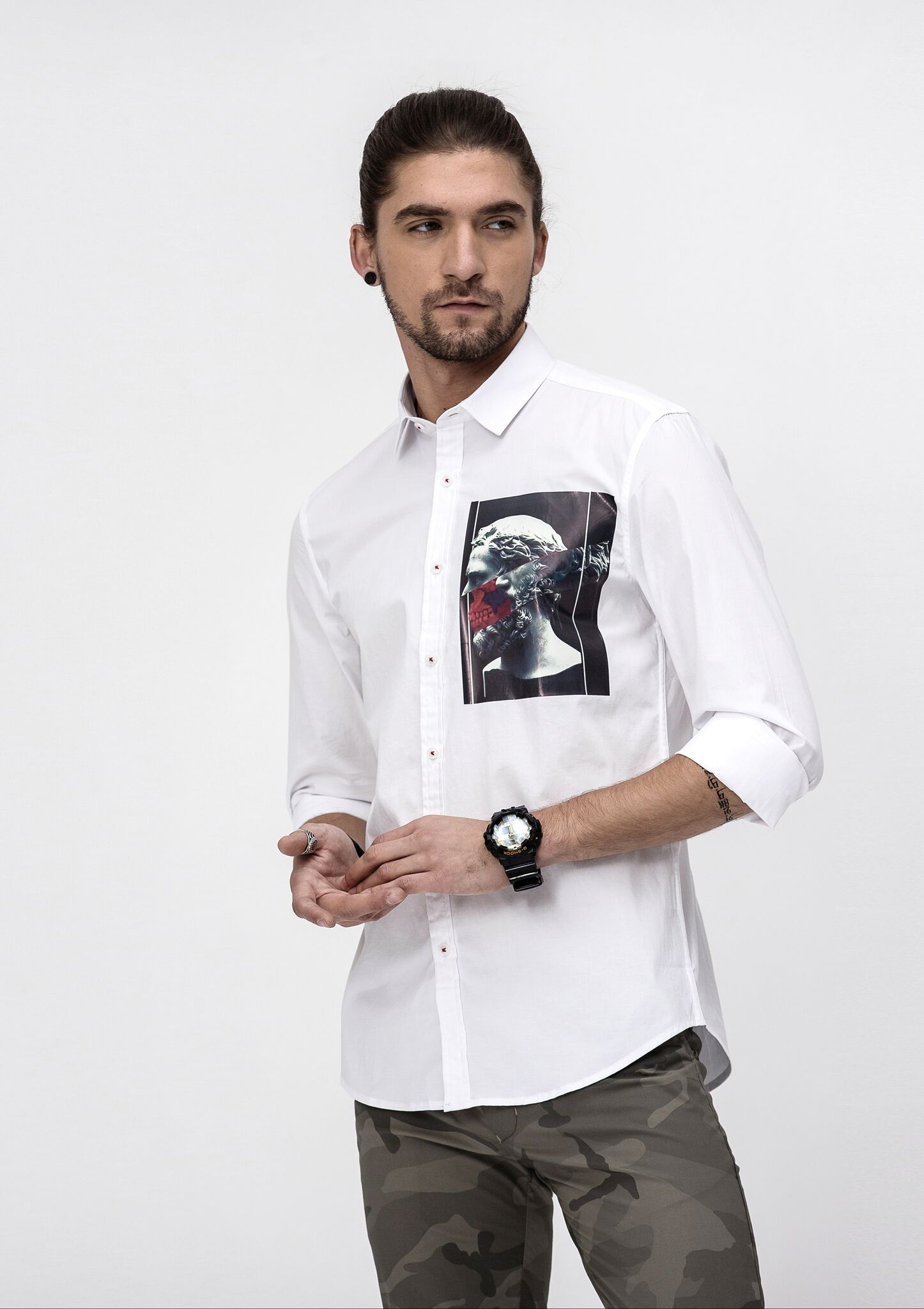 - Signature fit long sleeve shirt with button down band collar and sophisticated curved hem