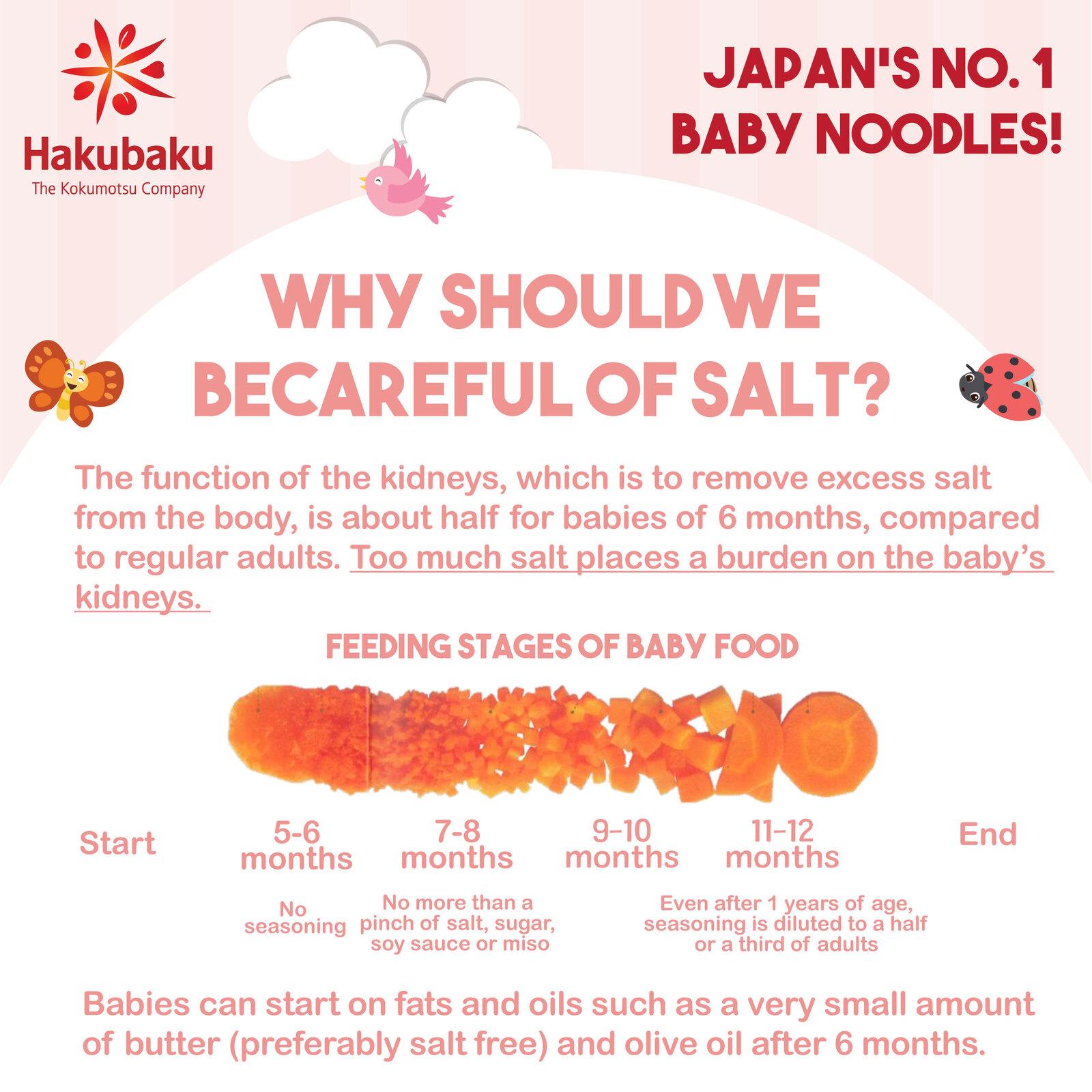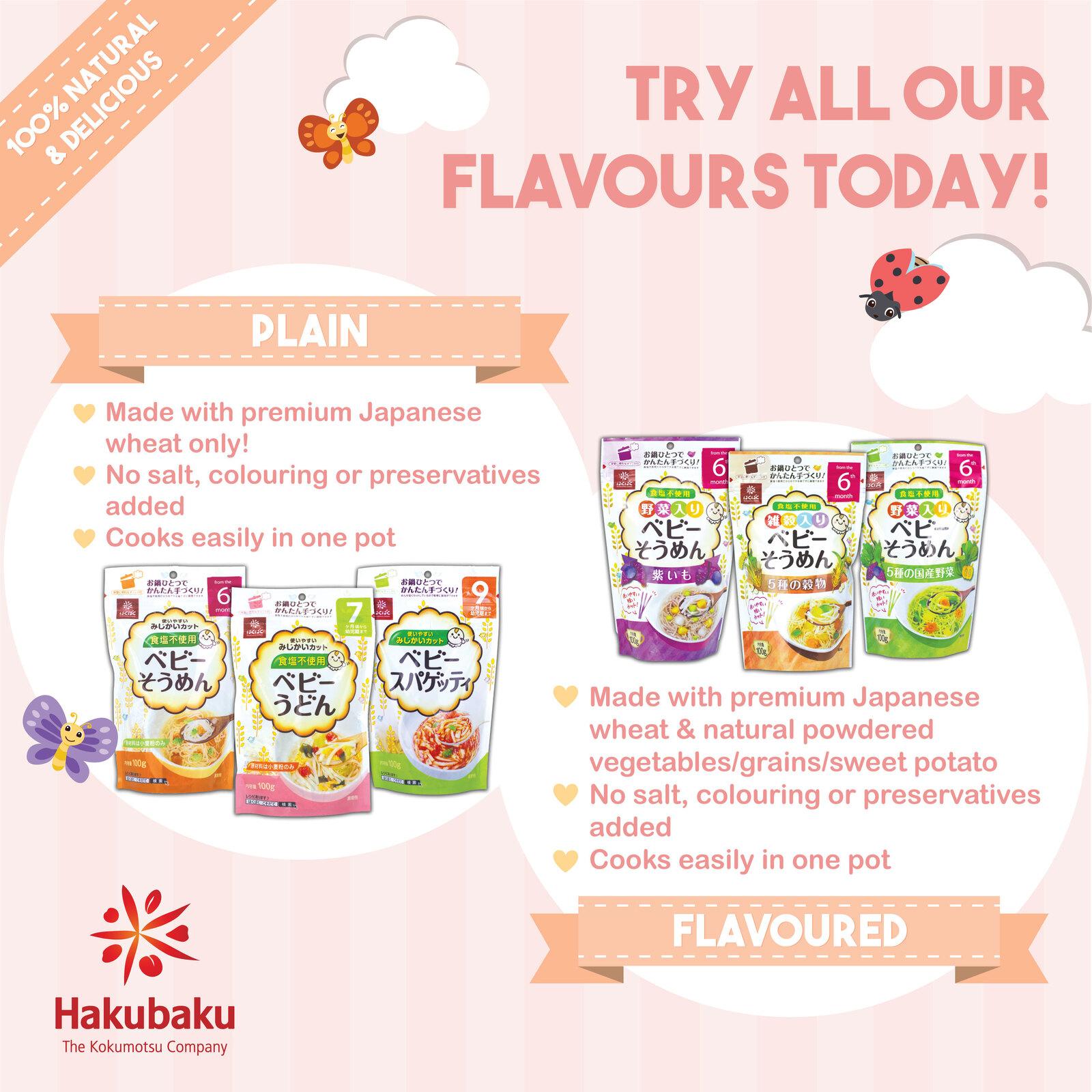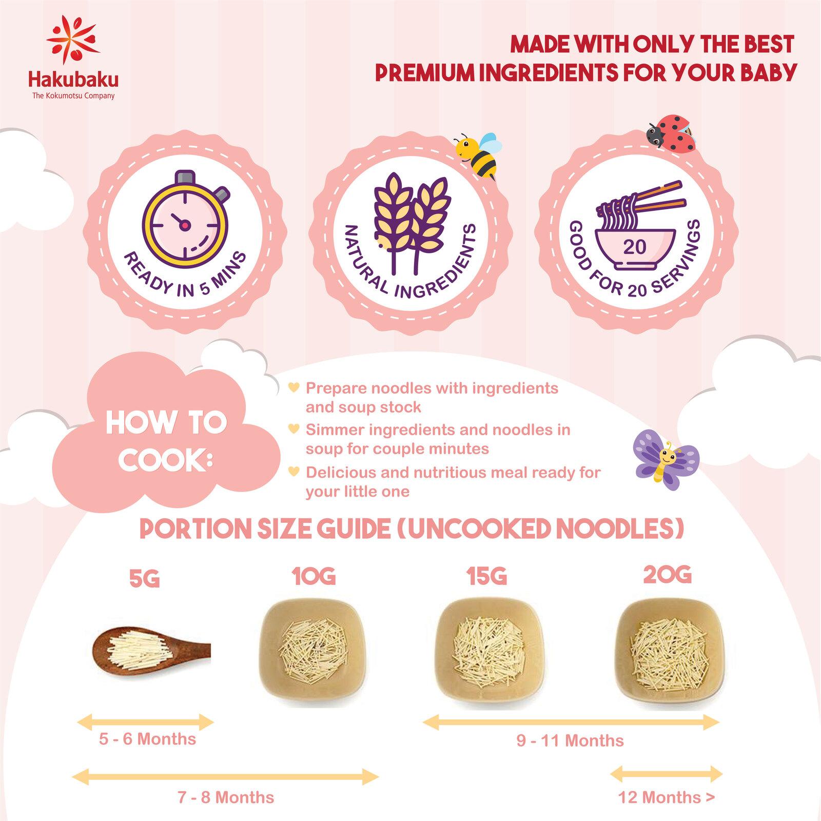 The best selling baby noodles in Japan, Hakubaku Baby Noodles: Somen, Spaghetti and Udon are great for baby's first noodles. For children 6 months and up. Made from a mixture of premium Japanese wheat, barley, millet, foxtail millet and pearl barley. Comes with no added salt. Small 2.5cm noodle sizes are great as a soup or mixed up with veggies and meat. Great for little hands to hold and eat as well.