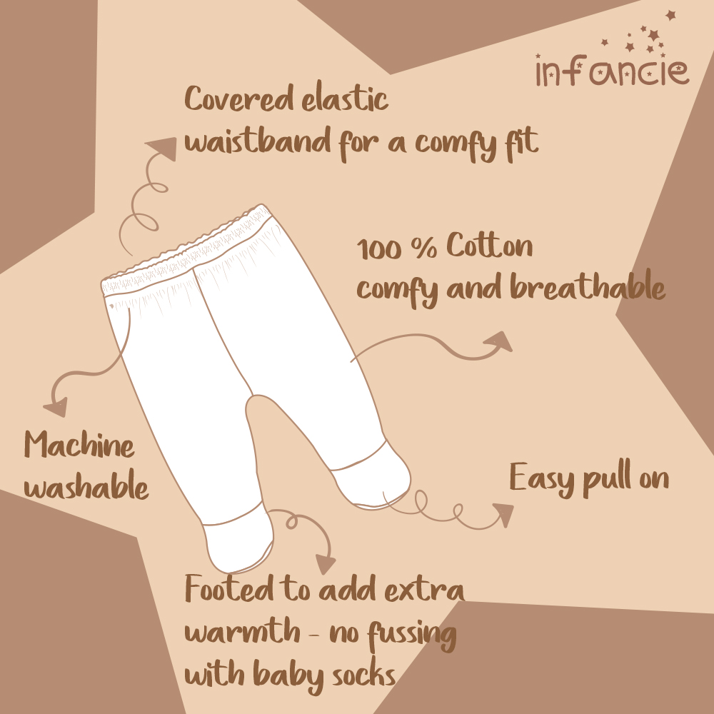 - These footed pants keep baby’s feet warm and contained in comfortable, built-in booties. Waistband is elastic for great fit to keep your little one cradled in softness. Baby-tested for comfort and kicks and parent-approved for style; these versatile pants can be worn with anything from tutus to tees. Making them an everyday wardrobe essential for every active baby.