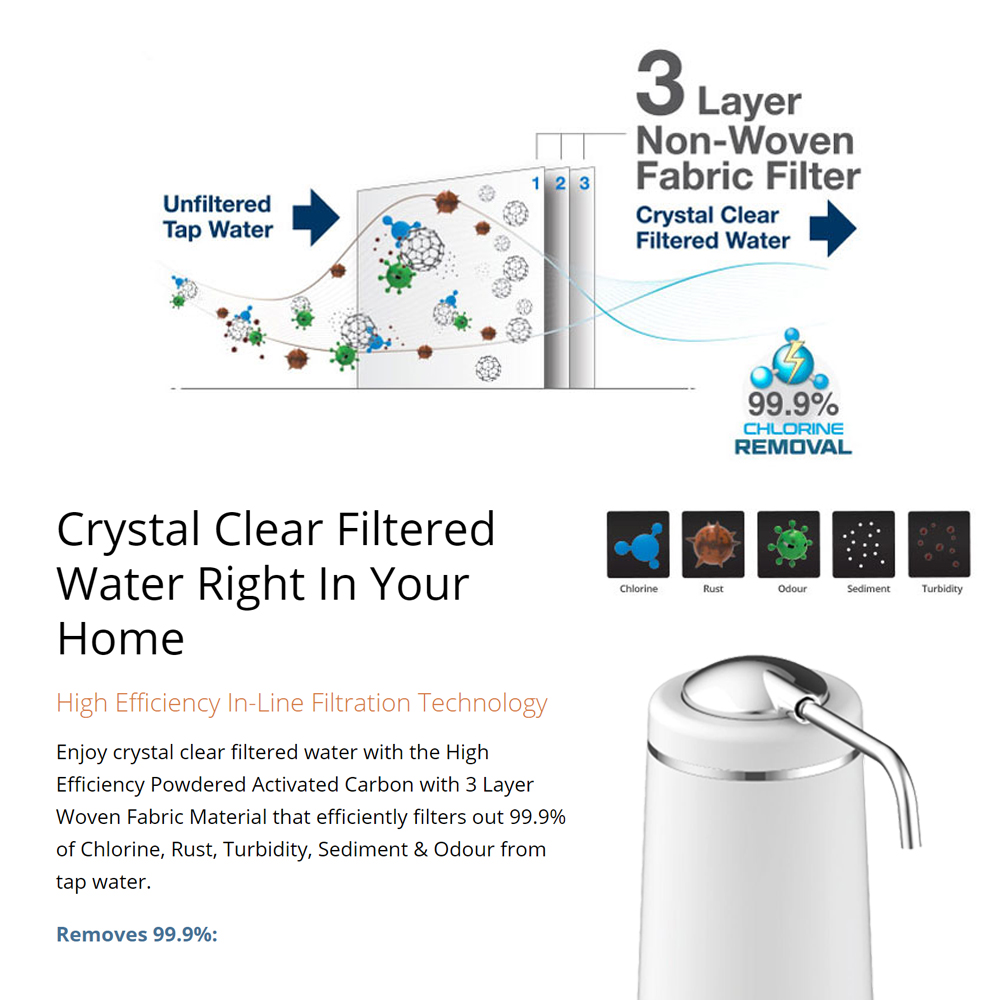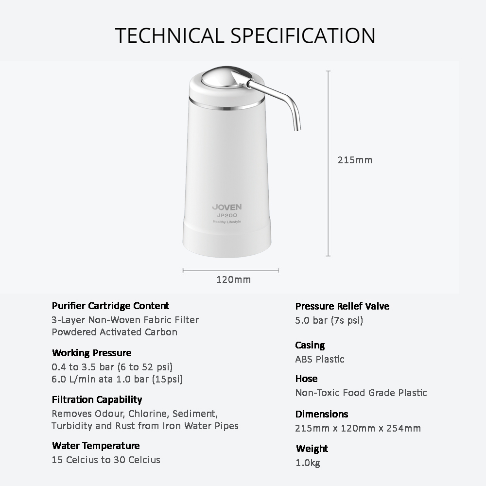 The result of extensive research and development, the JP200 fits practically and aesthetically into every home. The super efficient patent-pending Purifier Cartridge has a 3-layer non-woven fabric filter and powdered activated carbon that remove "99.9% chlorine, rust, turbidity, sediment and odour from tap water.