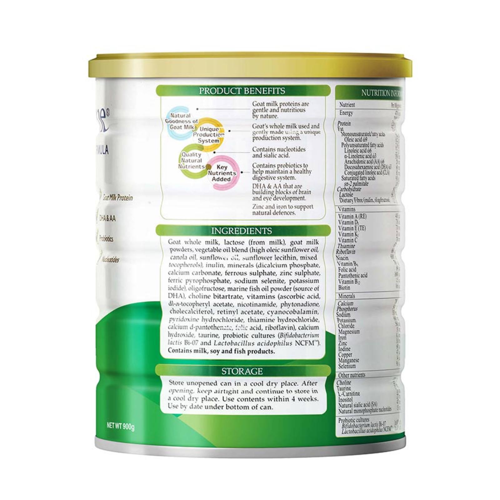 Goat whole milk, lactose (from milk), goat milk powders, vegetable oil blend (high oleic sunflower oil, canola oil, sunflower oil, sunflower lecithin, mixed tocopherols), inulin, minerals (dicalcium phosphate, calcium carbonate, ferrous sulphate, zinc sulphate, ferric pyrophosphate, sodium selenite, potassium iodide), oligofructose, marine fish oil powder (source of DHA), choline bitartrate, vitamins (ascorbic acid, dl-α-tocopheryl acetate, nicotinamide, phytonadione, cholecalciferol, retinyl acetate, cyanocobalamin, pyridoxine hydrochloride, thiamine hydrochloride, calcium d-pantothenate, folic acid, riboflavin), calcium hydroxide, taurine, probiotic cultures (Bifidobacterium lactis Bi-07 and Lactobacillus acidophilus NCFM™). Contains milk, soy and fish products.