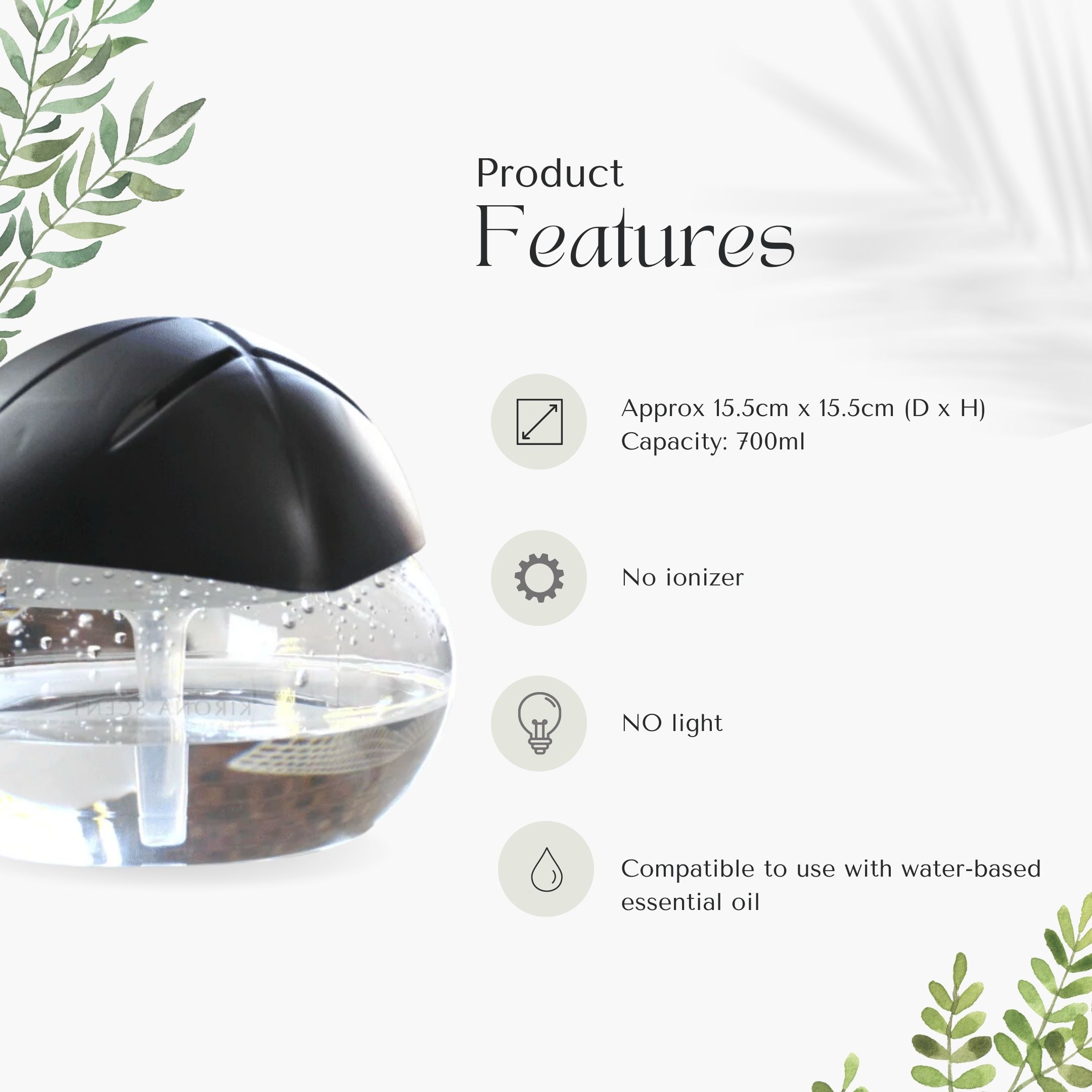 [KIRONA SCENT] Purity Leaf Water Air Purifier | Black | Air Revitalizer | Home & Office Fragrance | Air Cleaner & Purification | Remove Odour | Free 30ml Diffuser Essential Oil | Luxurious Per