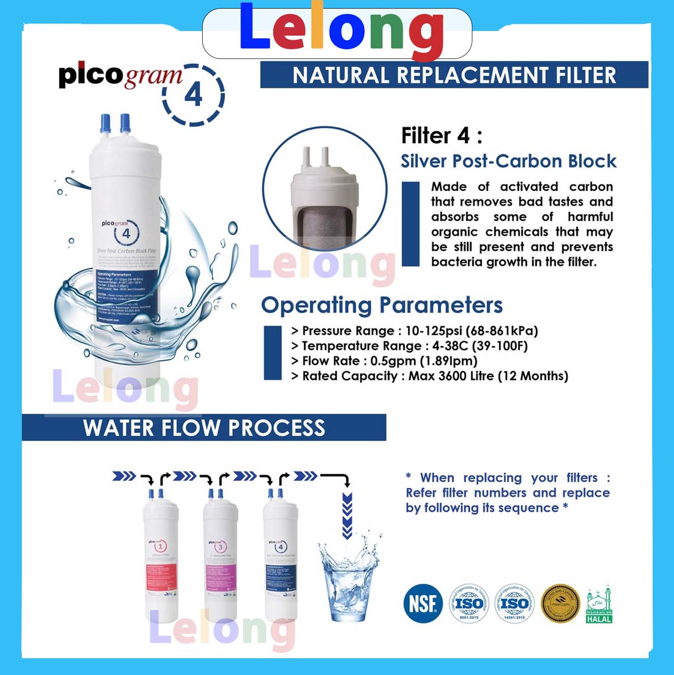 • SILVER-POST-CARBON FILTER (Capacity:3600L): This silver post-carbon block filter made of activated carbon removes the bad tastes and absorbs some of the harmful organic chemicals that may be still present and also prevent bacteria growth in the cartridge.
