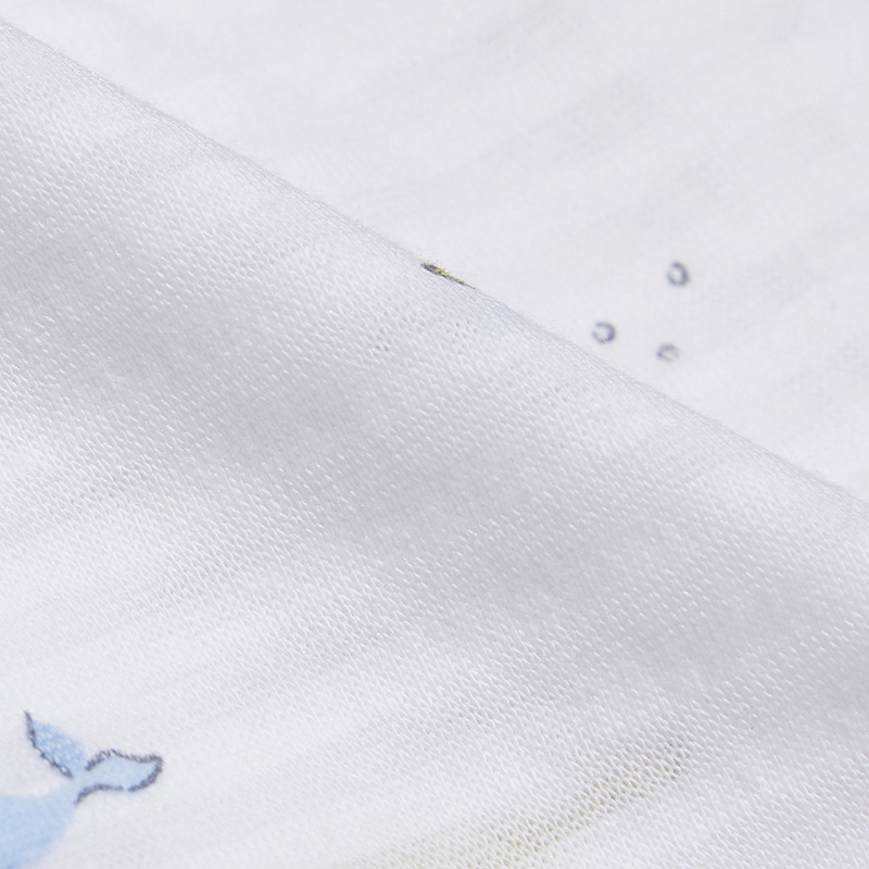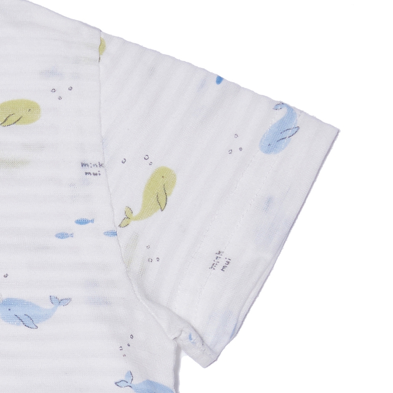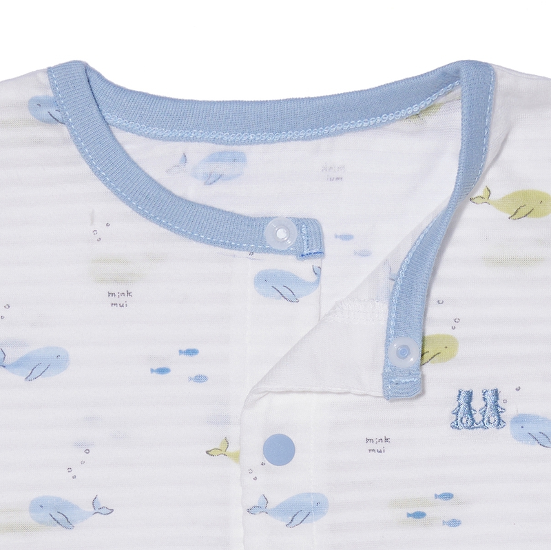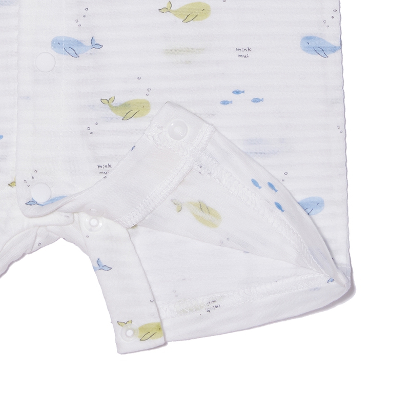 This half-sleeve baby bunting bodysuit is crafted from soft and lightweight jacquard fabric, featuring a cute whale pattern. The use of jacquard with a wide texture makes it breathable, ensuring a cool and comfortable feel for babies with sensitive skin.