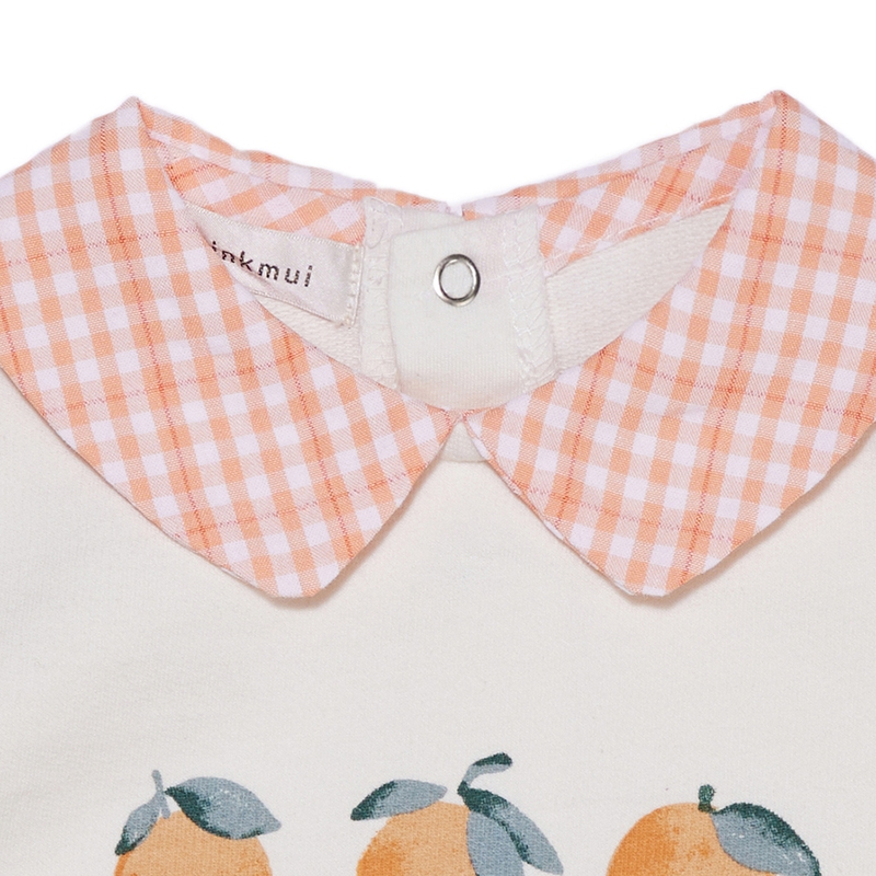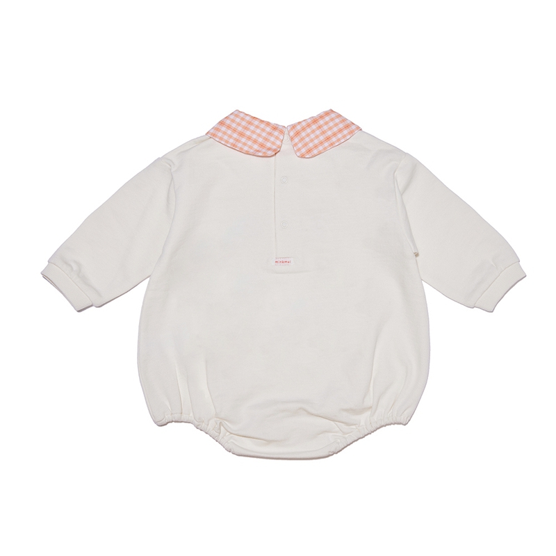 • This comfortable jersey bodysuit features a luxurious orange color. The orange checkered collar and orange detailing add a trendy and cute touch to the design.