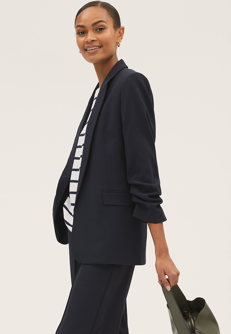 Throw on this easy-to-wear crepe blazer to instantly smarten up on casual days. Designed in a laid-back relaxed fit with 3/4 length ruched sleeves. Edge-to-edge design with no fastenings. Flap pockets and peaked lapels. Fully lined for comfort.Product Style: Relaxed fit, LinedMaterial Composition: 100% polyester, Lining - 55% polyester, 45% viscose, Care instructions: Machine washable even at 30°C
