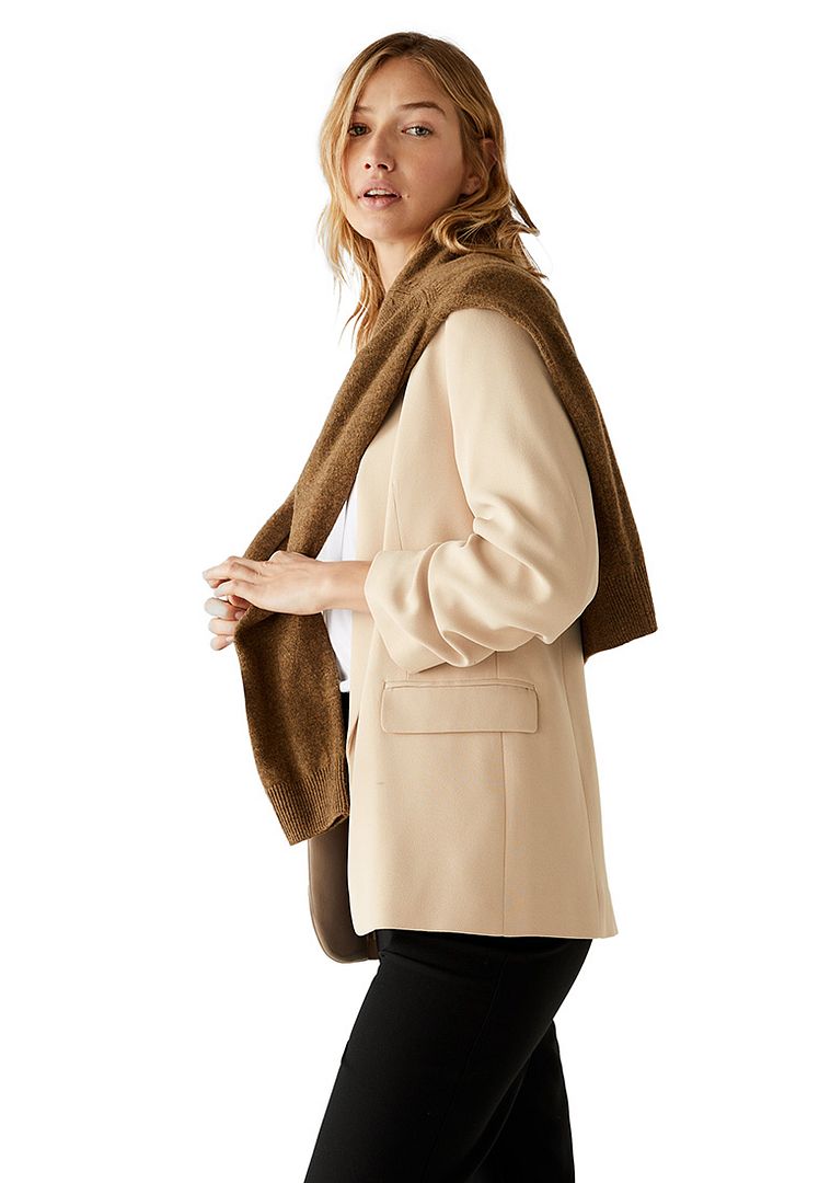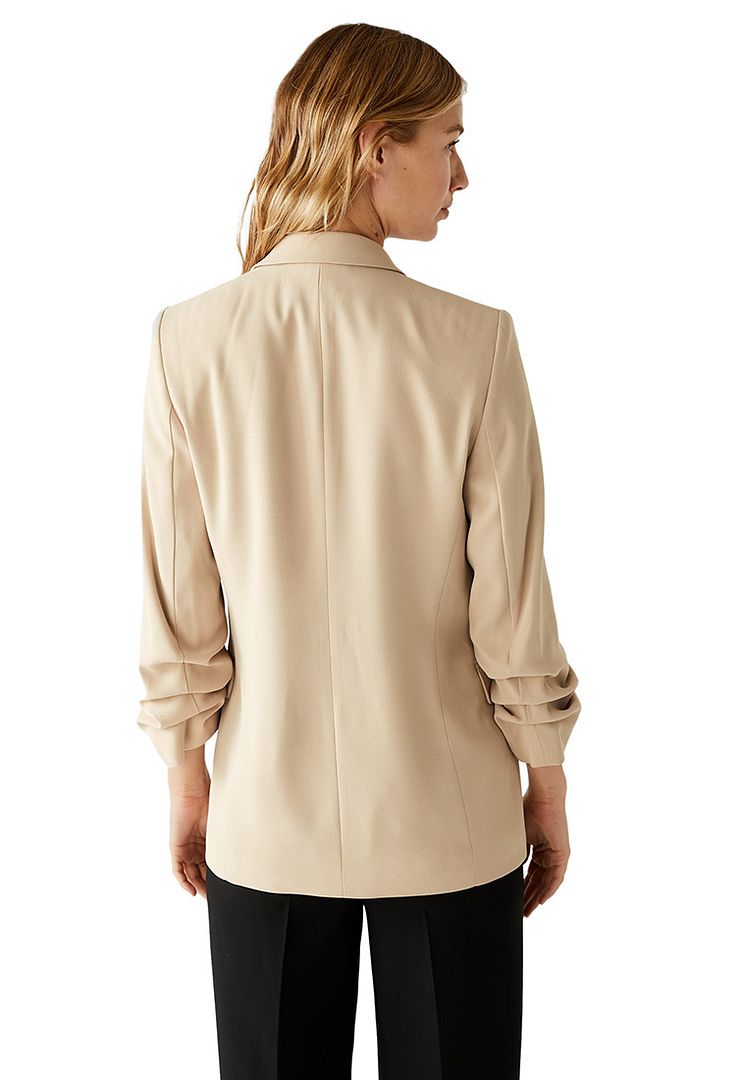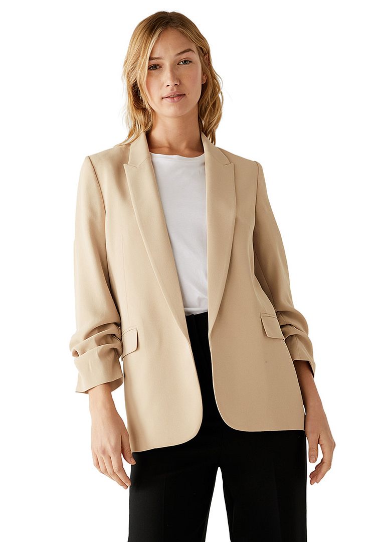 Throw on this easy-to-wear crepe blazer to instantly smarten up on casual days. Designed in a laid-back relaxed fit with 3/4 length ruched sleeves. Edge-to-edge design with no fastenings. Flap pockets and peaked lapels. Fully lined for comfort.Product style: Relaxed fit, Lined, Fabric Source, Lapel shapeMaterial Composition: 100% polyester, Lining - 55% polyester, 45% viscoseCare instructions: Machine washable even at 30º, Tumble dry