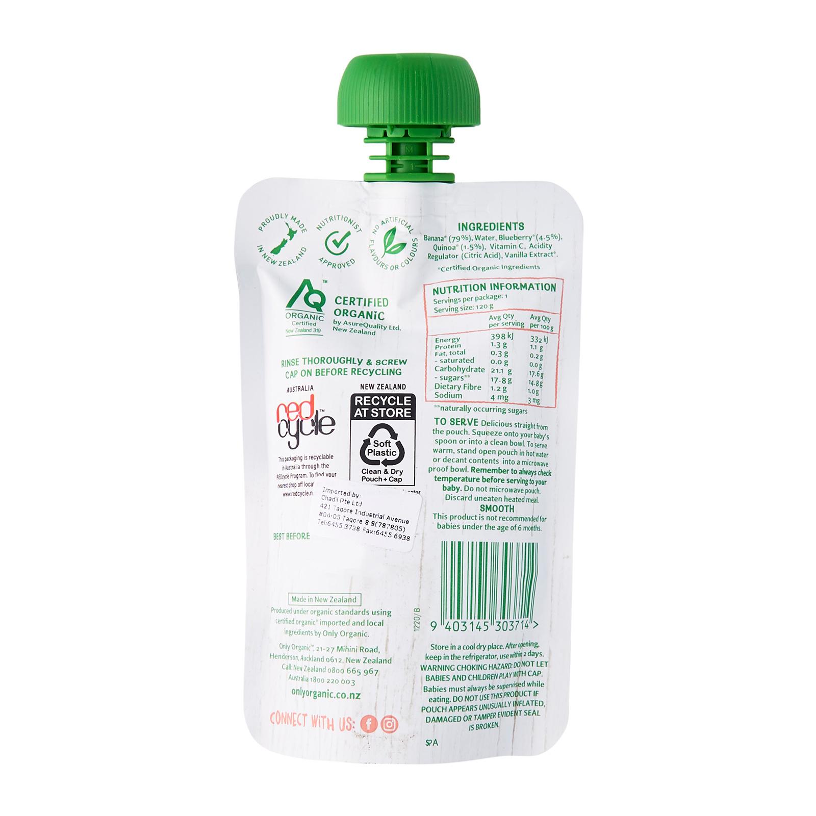 ORGANIC INGREDIENTS: Banana* (83%), Water, Blueberry* (4%), Quinoa* (2%), Acidity Regulator (Citric Acid), Vitamin C, Vanilla Extract*. *Certified Organic Ingredients Quinoa (KEEN-wah), often referred to as the supergrain or “mother of all grains”, is a herbaceous annual plant grown as a crop primarily for its edible seeds. An ancient grain, the plant has been cultivated for about 5000 years. Quinoa seeds are power-packed with dietary fibre, B vitamins and dietary minerals such as phosphorus magnesium, iron, manganese in amounts greater than other grains. Unlike some plant proteins, quinoa is a complete protein, meaning that it contains all nine essential amino acids that our bodies cannot make on their own, this makes it a popular vegan protein source. It is also naturally gluten-free.