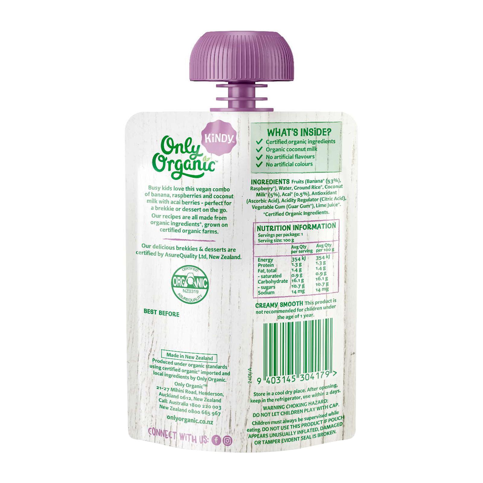ORGANIC INGREDIENTS: Fruits (Banana* (53%), Raspberry*), Water, Ground Rice*, Coconut Milk* (5%), Acai* (0.5%), Vitamin C, Acidity Regulator (Citric Acid). *Certified Organic Ingredients