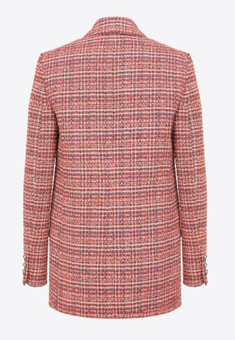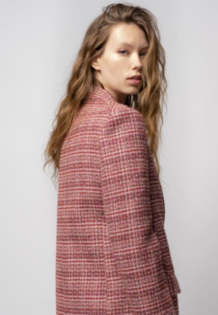 Classic blazer in patterned mouliné bouclé fabric. Lapel collar and flap-adorned side pockets. Lined. Single-breasted and fastened with one button. Made from a GRS-certified (Global Recycle Standard) sustainable material which contains recycled fibres; it aims to reduce resource consumption and increase product quality. Model is 179cm tall and wears a size 40..
