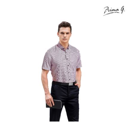 Prima Apparel PG041 Men Short-sleeved Mini Check Red Blue Shirt Cotton Tapered No Pocket Work Business Interview Formal Corporate|,|