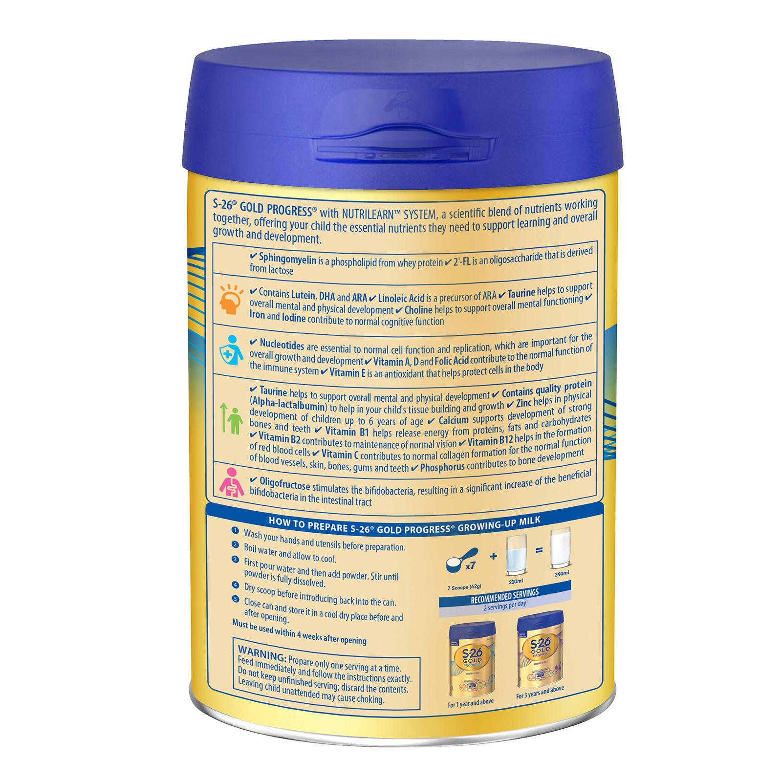 S-26 GOLD PROGRESS now with 2'-FL. It contains a scientific blend of Specialized 26 ingredients, together with DHA, Choline and Lutein to support your child's brain development. It also contains Alpha-lactalbumin, a unique high-quality protein that helps in tissue building and growth. Complemented with Oligo fructose, a soluble dietary fibre which stimulates an increase of beneficial bifidobacteria in the intestinal tract that helps maintain healthy digestive system.